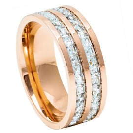 Rose Gold IP Plated Titanium Ring Double Row Princess cut Eternity CZ 8mm