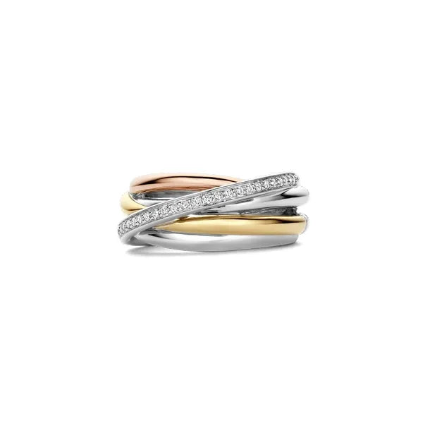 Embrace modern harmony with this TI SENTO tricolour silver Ring 12318ZT. Intertwined bands create an artful rhythm of radiant yellow gold-plating, soft blush rose gold-plating, premium silver, and dazzling cubic zirconia pave, all sculpted from 925 sterling silver. A line of brilliant-cut white cubic zirconia traces one band, adding light and dimension without overpowering the design. Slip it on as a stand-alone statement or layer it with slim stackers to curate your own story. Crafted with care for sensitive skin, this nickel-free, hypoallergenic ring ensures lasting comfort and quality.