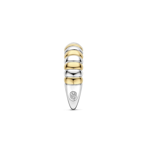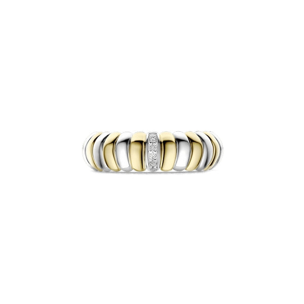 Indulge in sculptural brilliance with this TI SENTO gold-plated silver Ring 12383ZY. Forged from 925 sterling silver, the band alternates mirror-bright platinum sections with radiant yellow-gold links, creating a dynamic rhythm around the finger. A discreet panel of pavé-set white cubic zirconia crowns the design, adding refined sparkle that elevates the play of warm and cool tones. Bold enough to stand alone yet slim enough to stack, it slips seamlessly from crisp office tailoring to after-dark silk. Nickel-free and hypoallergenic, it offers luxurious comfort with every wear.