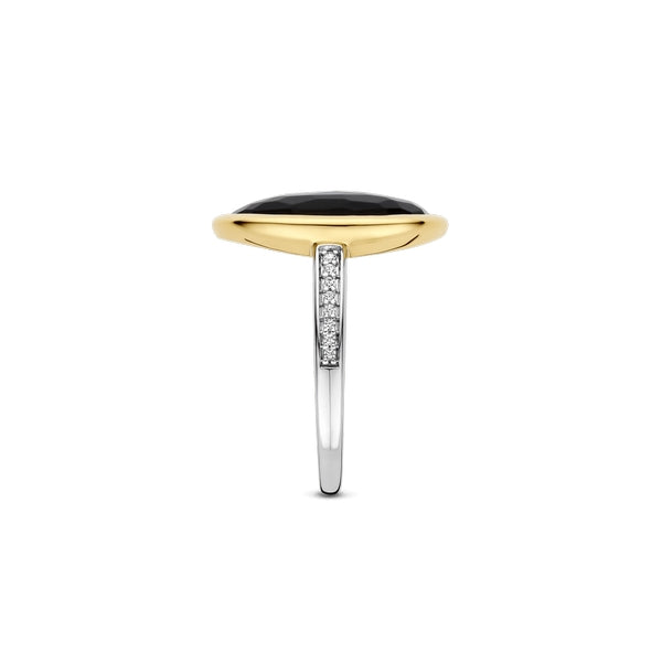Discover midnight allure with this TI SENTO gold-plated silver Ring 12386BY. Crafted from 925 sterling silver and sealed with a mirror-bright platinum finish, the slender band leads the eye to an organically shaped jet-black stone whose faceted “pebble” surface flickers with subtle flashes of light. A smooth yellow-gold rim frames the gemstone, while a tapering row of pavé-set white cubic zirconia along one shoulder adds refined sparkle without stealing the spotlight. Wear it solo for bold contrast, or stack it with slender metallic rings to build a curated glow. Nickel-free and hypoallergenic, this piece stays skin-friendly all day long.