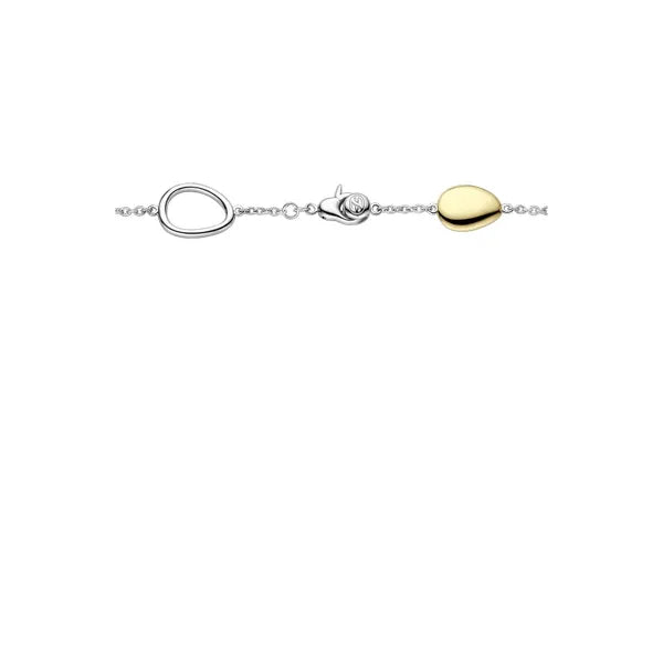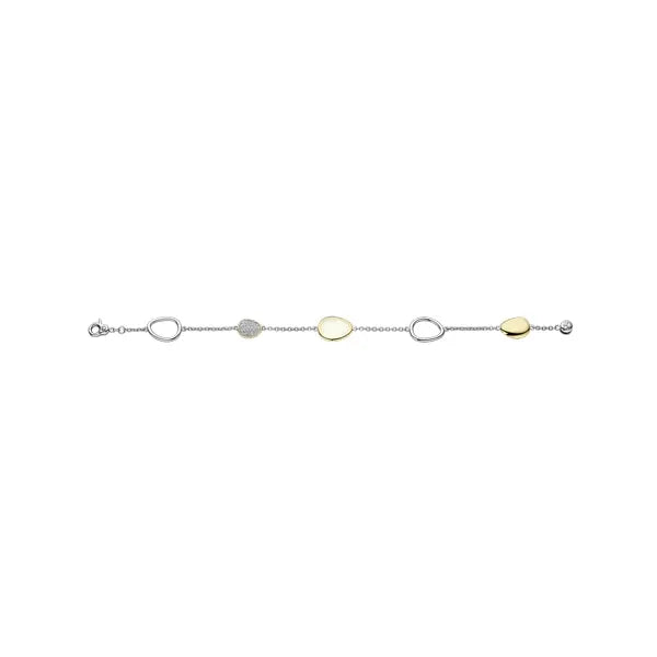 Embrace fluid harmony with this TI SENTO silver Bracelet 23083MW. A delicate 925 sterling-silver chain, given a cool platinum sheen, is punctuated by five pebble-shaped stations: a milky-white stone framed in radiant yellow-gold, a polished yellow-gold accent, a mirror-bright platinum pebble, and a pavé disc set with brilliant white cubic zirconia. Together, they create a rhythmic play of colour, light, and a space that feels both effortless and refined. Let it stand alone for understated polish, or layer it with bangles for a curated stack rich in texture. Like all our jewellery, this bracelet is nickel-free and hypoallergenic, promising not just style, but also comfort and quality that stands the test of time.