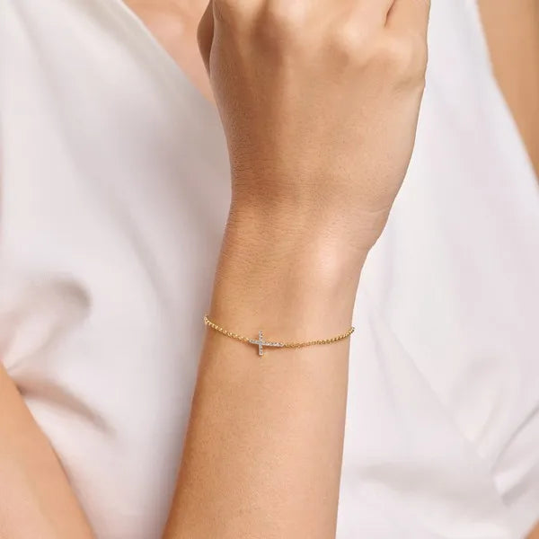 This delicate bracelet features a diamond cross, adding a subtle glimmer to your everyday moments. A timeless symbol of grace and strength, it's perfect for layering or wearing solo.