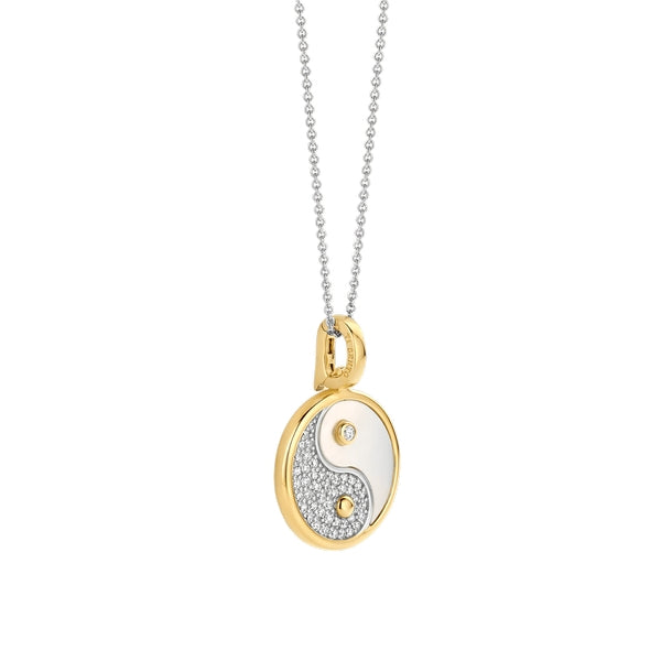 Find your perfect balance with the TI SENTO Gold-Plated Yin Yang Pendant 6843MW, a piece that embodies harmony, duality, and modern elegance. Crafted from premium 925 sterling silver, this pendant features a yellow gold-plated frame encasing the timeless yin-yang symbol. One half sparkles with pavé-set cubic zirconia, while the other shimmers with luminous mother-of-pearl inlay, creating a striking contrast of textures and light. Designed for effortless versatility, this pendant is suspended from a gold-plated clip ring, allowing you to attach it to any of your favourite necklaces and personalise your look. Whether worn alone as a meaningful statement or layered with other charms, this pendant brings a touch of spiritual elegance and contemporary style to any jewellery collection. Nickel-free and hypoallergenic, it ensures luxurious comfort with every wear. Let this yin-yang beauty be your daily reminder of balance, energy, and timeless sophistication.