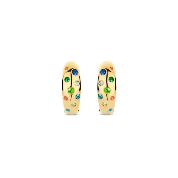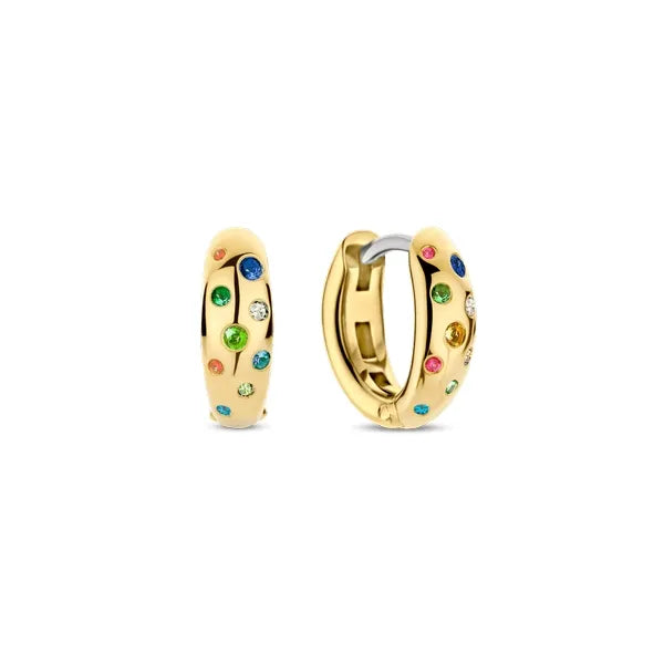The TI SENTO Gold-Plated Silver Stardust Hoop Earrings 78006MC bring a joyful burst of colour and cosmic charm to your everyday style. Crafted from premium 925 sterling silver and bathed in warm yellow gold plating, these hoops are playfully sprinkled with multicoloured cubic zirconia—deep blues, lush greens, warm ambers, and soft pinks—echoing the vibrant hues of a sun-drenched summer. Designed for effortless styling, these radiant hoops add a pop of playful sparkle whether worn solo or stacked for a bold, layered look. Their secure hinge closure ensures a seamless fit, taking you from breezy daytime moments to luminous evening elegance. Nickel-free and hypoallergenic, they promise luxurious comfort with every wear. Let these stardust-inspired beauties shine bright on your ears.