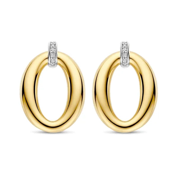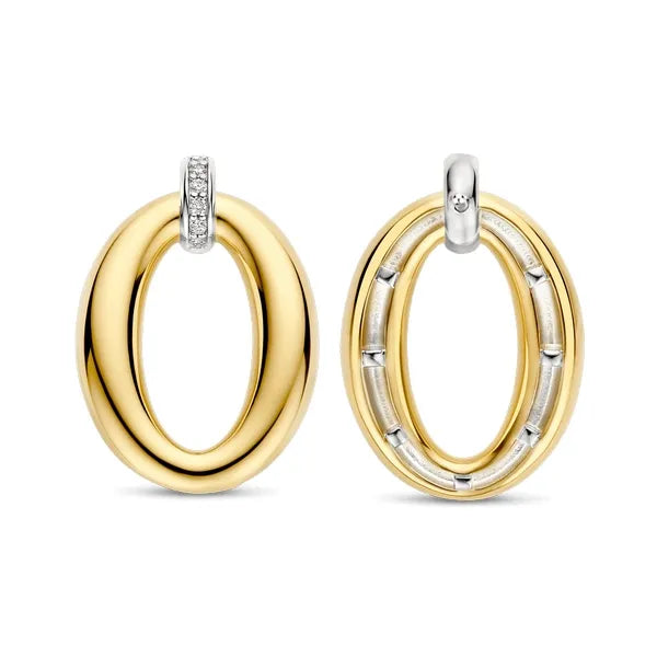 These TI SENTO Gold-Plated Silver Oval Earrings 78013ZY bring a bold, contemporary spin to effortless elegance. Crafted from premium 925 sterling silver, these earrings feature a smooth, yellow gold-plated oval link suspended from a pavé-set cubic zirconia connector, delivering just the right amount of shimmer. The mix of warm golden tones and cool platinum-plated accents creates a striking contrast, blending modern edge with timeless appeal. A statement of connection and strength, these interlocking ovals symbolise the seamless harmony between boldness and beauty. Designed to elevate everything from a power suit to an evening ensemble, these earrings add an instant touch of sophistication. Nickel-free and hypoallergenic, they promise luxurious comfort with every wear. Whether styled with a sleek ponytail or tousled waves, these versatile beauties are a refined essential for any jewellery collection.