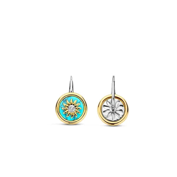These TI SENTO gold-plated turquoise earrings 7971TQ are a radiant fusion of summer charm and vibrant elegance. The sun symbol, with its yellow gold-plated rays and a brilliant cubic zirconia centre, takes centre stage against a backdrop of captivating turquoise, all beautifully framed by radiant yellow gold-plating. Crafted from premium 925 sterling silver and plated with yellow gold, these earrings boast a coin-shaped design that adds an air of sophistication to any outfit. The turquoise backdrop evokes the serene essence of the Mediterranean Sea, while the sun symbol infuses these pieces with positive energy. Perfect for adding a touch of playful allure to your style, these earrings are a symbol of warmth and radiance. Create a curated ear stack by pairing these sunlit earrings with smaller stud earrings or huggie hoops. Combine them with basic gold-plated studs or turquoise accents to create a harmonious look. Like all our jewellery, these earrings are nickel-free and hypoallergenic, ensuring not just style, but also comfort and quality.