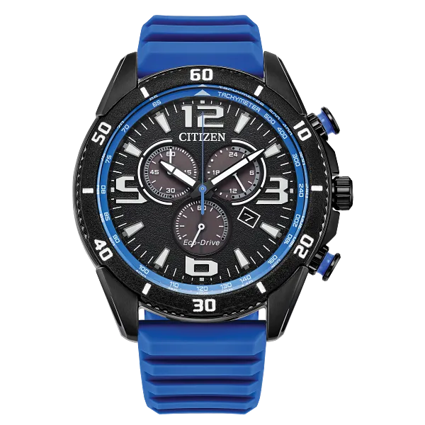 On the dial, the sporty styling continues, with lume-filled, highly legible hour markers anchoring the look, while a blue tachymetric scale outlines the display. Advanced functions include a 1-second chronograph measuring up to 60 minutes, 12/24 hour time, and a date indicator at the 4 o'clock position. The men?s high-performance Brycen is sustainably powered by any light with Citizen's proprietary Eco-Drive technology that never needs a battery. Water resistant up to 100 metres. Calibre H500.