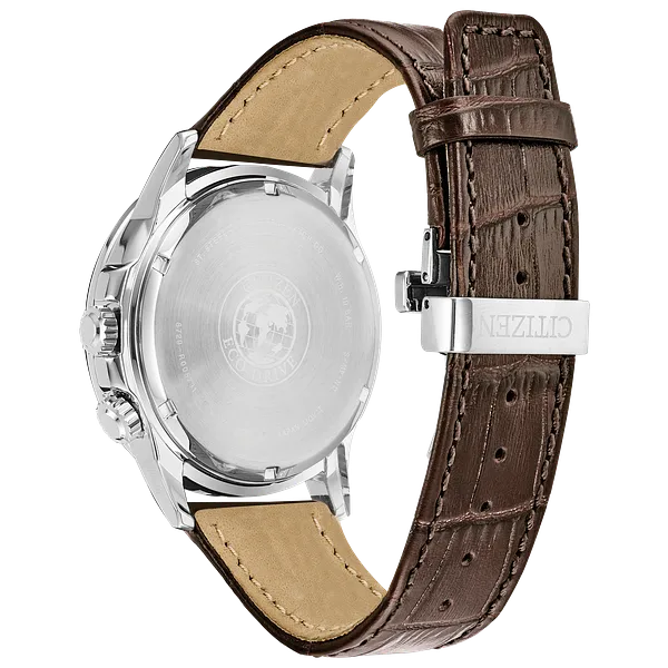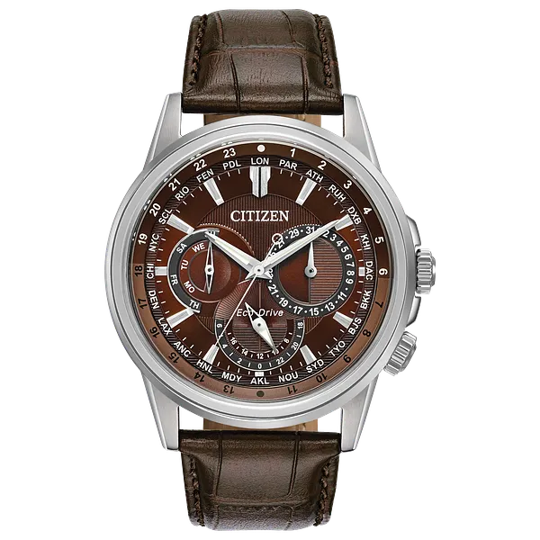 Bring sophistication to your day with the CITIZEN® Calendrier. This timeless watch features world time in 24 cities, 12/24-hour time, and day/date. It is shown here in a stainless steel case with a brown leather strap and a brown dial. Featuring our Eco-Drive technology – powered by light, any light. Never needs a battery.