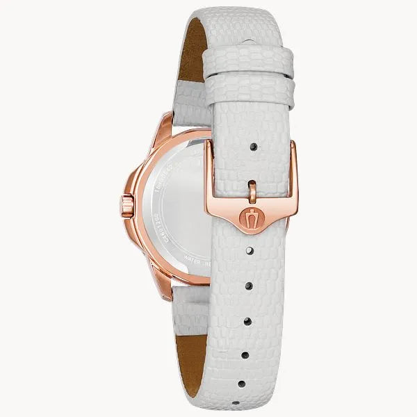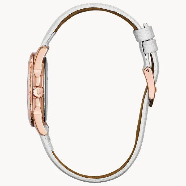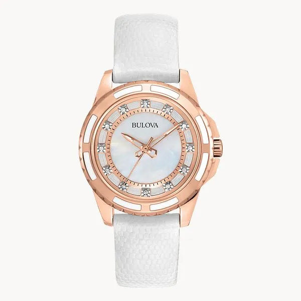 From the Classic Collection. In stainless steel with rose-gold ion-plated finish, 12 diamonds individually hand-set on a white mother-of-pearl dial with rose-gold accents, domed crystal, white enamel bezel accents, luminous hands, second hand, and white leather strap.