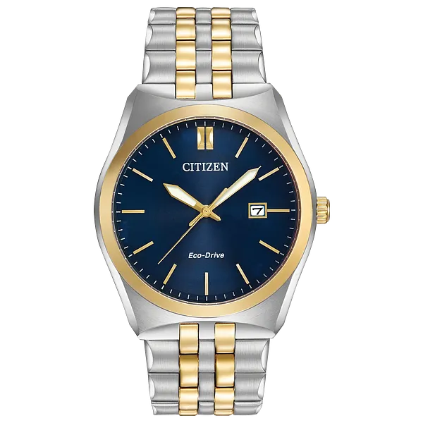 Sporty yet elegant, CITIZEN®'s Corso is the byword for versatility and the perfect addition to any wardrobe. Shown in two-tone stainless steel with a deep blue dial and date display. Water resistant up to 100 metres.