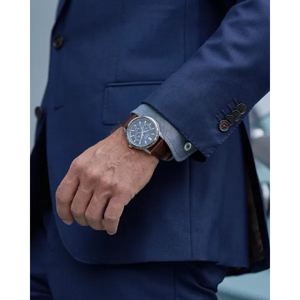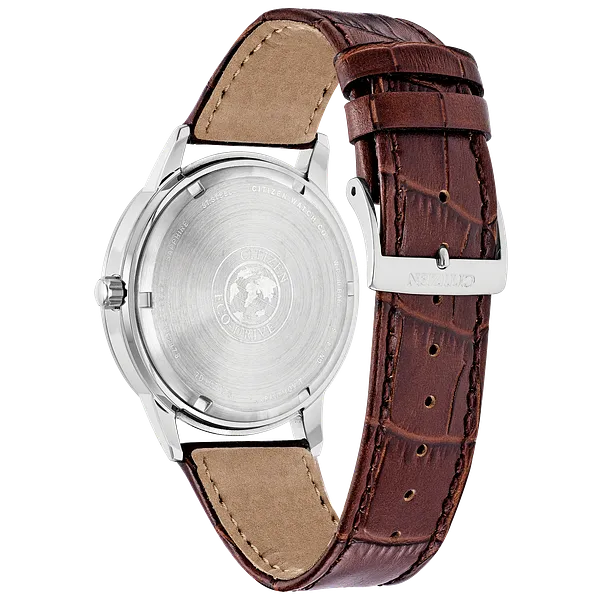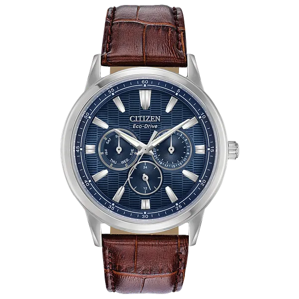 This timepiece from CITIZEN®'s Corso collection offers a combination of functional simplicity with a touch of timeless elegance, and is more than just a solar watch, it's a timepiece powered by any light with Eco-Drive technology. This model features a stainless steel case with a chocolate brown leather strap, a midnight blue dial, a sapphire crystal, day/date display, and 12/24-hour time.