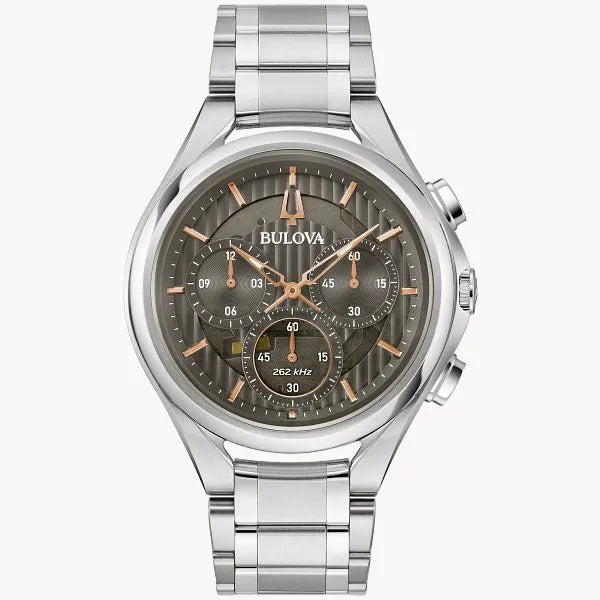 This new Bulova men’s five-hand chronograph timepiece pushes the groundbreaking CURV collection in a new direction that features unparalleled sophistication together with Bulova’s cutting-edge technology. CURV timepieces are equipped with the world’s first curved chronograph movement, with high-precision 262khz quartz technology offering exceptional accuracy of 5 seconds per month. This new CURV model features a dynamic silver-tone stainless steel case with brushed and polished finishes and a curved sapphire crystal. The striking gray dial features striped patterning, with a translucent ring offering a glimpse at the intricate movement beneath. Rose gold-tone stainless steel markers and hands offer contrast against the dial, while three sub-dials display the elapsed chronograph time in 12-hour, 60-minute, and 60-second intervals. The chronograph 60-second sub dial at 6 o’clock doubles as the standard seconds hand. The dual mode is implemented by the 4 o’clock pusher. The watch is paired with a matching tapering silver-tone stainless steel bracelet with a deployant clasp with pushers. Reinterpreting the elegant lines of the original CURV, this new Bulova timepiece presents a refined dress aesthetic tailored to a sophisticated lifestyle.