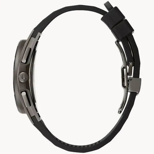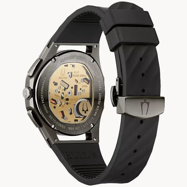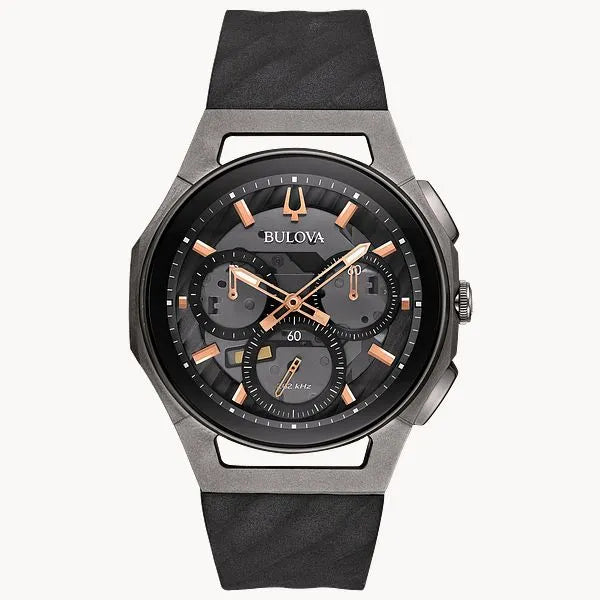 From the new CURV Collection. The worlds first curved chronograph movement features high-performance quartz technology with 262 kHz vibrational frequency for precise accuracy. Five-hand chronograph in titanium and stainless steel case, dark grey exhibition dial with rose gold-tone accents, exhibition screw-back case, curved sapphire glass with black metallization on the outer crystal, black rubber strap, and water resistance to 30 meters.