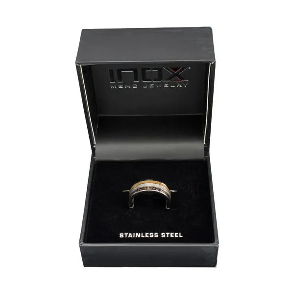 Men's Matte Finish Black Dinosaur Bone, Meteorite & Whiskey Barrel Wood Inlay Comfort Fit Ring.