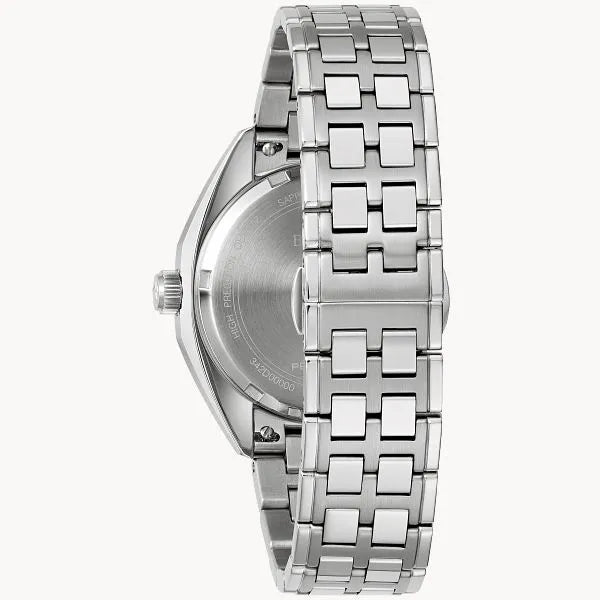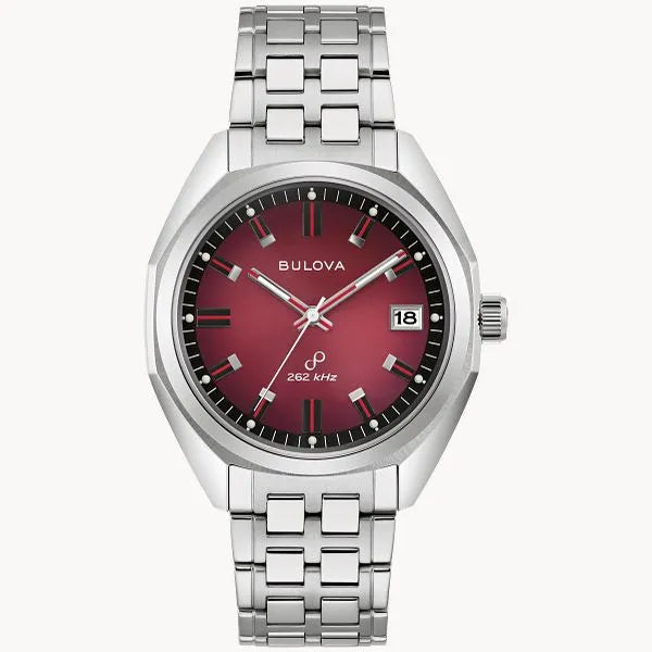 Straight from the 1970s comes the Bulova 1973 Jet Star, an iconic model from the brands impressive history, now equipped with an equally impressive movement. Borrowing from its historic forebear, the stainless steel case features a striking angular design with broad facets and a domed sapphire crystal. The magnificently claret sunburst dial is accented by a black chapter ring, applied black and red hour markers, and matching silver tone and red hands. Luminescent plots at each hour and fill in the hands allow for exceptional legibility in every environment, while a date display sits perfectly at 3 o’clock. The new Jet Star is powered by Bulova’s Precisionist movement, a revolutionary 8-jewel quartz mechanism vibrating at a remarkable 262kHz, accurate to 5 seconds per month with increased resistance to temperature changes, and with a sweeping seconds hand. Complementing the stainless steel case is a matching bracelet with a deployant clasp closure and latched spring bars for easy release. Strut your stuff in legendary style with the high-flying Bulova 1973 Jet Star, a legendary design recreated for the modern connoisseur.