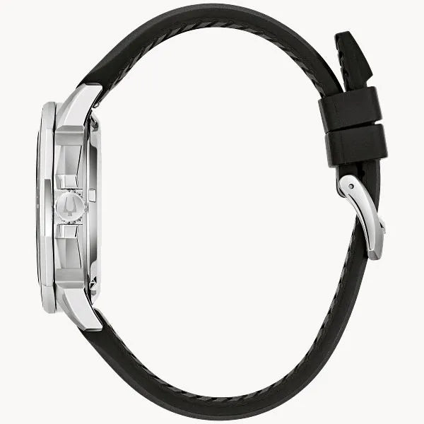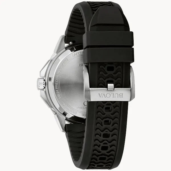 An incredibly bold design, this men’s Bulova Marine Star Precisionist sport watch pushes the limits with Bulova’s cutting edge technology and a strikingly modern case. Defined by a rugged, angular profile, the 43mm stainless steel case features brushed facets and polished accents, with a unidirectional timing bezel with a ceramic insert, a sapphire crystal, and a screw-down crown ensuring 200m water resistance. The vibrant yellow dial takes its inspiration from the undulating crests of the ocean, with a wave pattern accented by applied hour markers and a bold handset, all featuring luminescent material for unrivaled legibility in all conditions. A date window is positioned at 3 o’clock, while the red-tipped seconds hand sweeps smoothly around the dial thanks to Bulova’s proprietary Precisionist movement, a revolutionary 8-jewel quartz mechanism vibrating at a remarkable 262kHz and accurate to seconds per year with increased resistance to temperature changes. Paired with a durable silicone strap with a pin buckle closure, this men’s Bulova timepiece is equipped to handle everything from the office to the ocean.