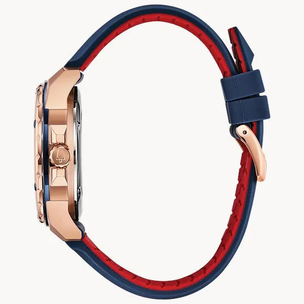 Introducing the new Marine Star featuring a three-hand automatic movement showcased in an open aperture. Rose gold tone stainless steel case with blue tone outer ring. Blue dial with flat mineral crystal. Blue textured silicone strap with a contrasting red underside. Water resistance to 200 meters.