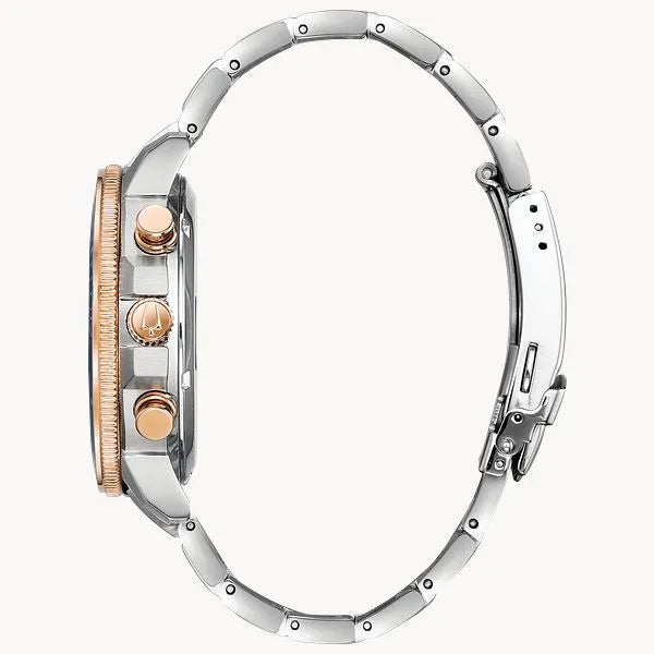 From the Marine Star Collection New six-hand chronograph movement with 200-meter water resistance. In stainless steel with rose gold-tone accents and blue glass insert on ratcheted rotating bezel, blue dial with luminous hands and markers, and calendar feature, domed mineral crystal, screw-back case, stainless steel and rose-gold tone bracelet with fold-over buckle closure, safety bar and extender.
