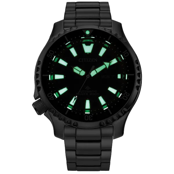 A classic never goes out of style. The newly reimagined Promaster Dive Automatic men's watch by Citizen goes deeper into the history of the original version of this diving watch that was released in 1989 for the new generation of dive watch enthusiasts. In silver-tone stainless steel, a design element that stands out is the distinctive, serrated bezel design that was inspired by a ?Fugu?, the Japanese name for pufferfish. Featuring a 3-piece, 44mm case, anti-reflective sapphire crystal, and a silver-tone stainless steel case and bracelet, the stainless steel easy grip features a blue aluminum insert that surrounds the blue dial and luminous hands and markers, while the case back features an engraving of a fugu or pufferfish. This technically advanced and stylish men's sport watch powered by the motion of your wrist comes in an exclusive collector's dive tank box and is ISO compliant with a screw-down crown and water resistant to 200 metres. Calibre 8204.
