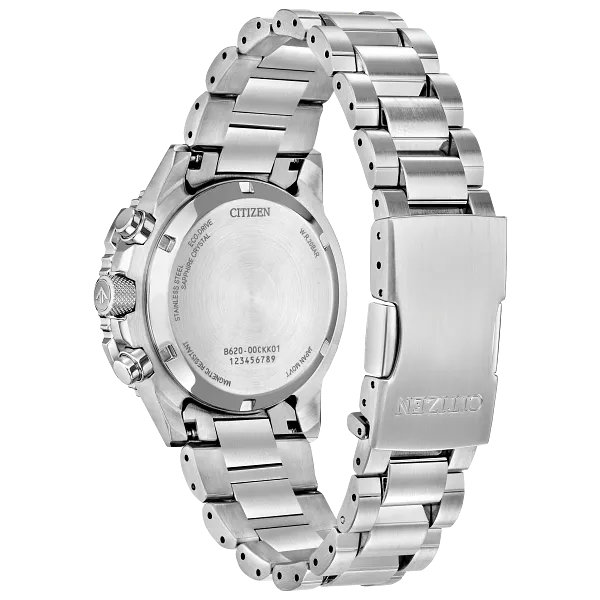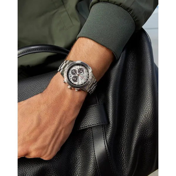 On the dial, a silver-tone colourway with red, black, and white accents adds to the watch's superior legibility, while a sapphire crystal and 200m of water resistance protect it all. Functions include a 1/5 second chronograph measuring up to 60 minutes, 12/24 hour time displays, and a date indicator, all powered by our Eco-Drive technology? sustainably powered by light and never needing a battery. Calibre B620.