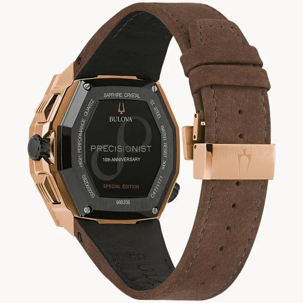 Marking the 10th anniversary of the Precisionist movement, the Series X Special Edition is a celebration of unparalleled accuracy. The special edition timepiece features a distinctive rose gold-tone stainless steel case with a gray Damascus steel top ring insert. The black dial features a calendar window and a view into the proprietary Precisionist eight-hand chronograph high-precision quartz movement. The fine brown leather strap is complete with a deployant buckle. The case features a curved sapphire crystal with AR coating, screw down case back, and water resistance to 50 meters.