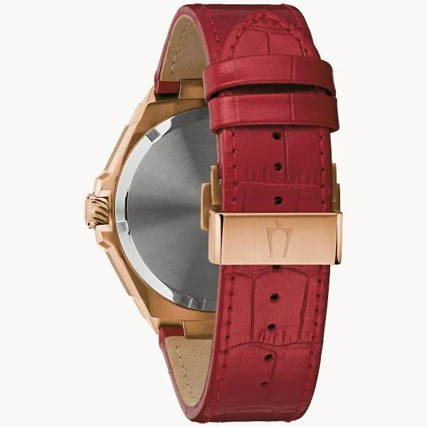 Defined by refinement and driven by innovation, this Series X timepiece balances Bulova’s most advanced technology with forward-thinking design. The bold case design features rose gold-tone stainless steel and faceted construction, with a blend of polished and brushed finishes, a curved sapphire crystal with anti-reflective coating, and a bezel and strap attachment adorned with 154 spectacular hand-set 1mm light rubies totaling 2.0 carats. The striking silver-white dial features a brushed finish with rose gold-tone hands and applied markers with luminescent fill, a date window, and a seconds hand with a smooth sweep. A translucent aperture in the dial offers a peek behind the curtain at Bulova's proprietary Precisionist movement, a revolutionary 8-jewel quartz mechanism accurate to 5 seconds per month and with increased resistance to temperature changes. The watch has 100m water resistance and is complemented with a crocodile grain leather strap in a rich pearlized red with a push-button deployant clasp. An instant classic, this Bulova timepiece provides a distinguished elegance in every setting.