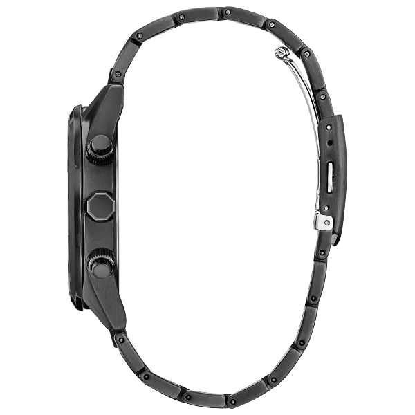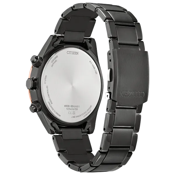 Innovative technology once again meets elevated chronograph styling in Citizen's latest: the new Radio Control AT8265. A 43mm stainless steel case in black ip solidifies the design, with a matching bracelet securing the watch to the wrist. A faceted crown and chronograph pushers add a stylish touch, balancing its traditional details with smart, modern accents.On the deep blue dial, a vertical three-register chronograph is at work, with appliques of rose gold-tones adding dimensionality alongside the utility of a 3 o'clock date display. Other advanced features include world time in 26 time zones, a perpetual calendar with day and date indicators, 12/24-hour timekeeping, and a power reserve display. Featuring light-powered Eco-Drive Atomic Timekeeping functionality, the radio controlled timepiece self-adjusts to time or calendar when traveling overseas by receiving local time signals in four different regions. Water resistant up to 100 metres. Calibre H800.
