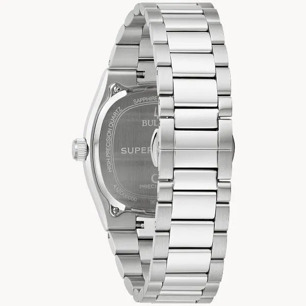 Drawing inspiration from the incredible Bulova Super Seville Day-Date from the 1970s, the new Super Seville merges retro aesthetics with state-of-the-art Precisionist technology for a timeless modern appeal. The silver-tone stainless steel 38mm case has the versatility to be worn by most anyone and makes a bold statement with a seamless silhouette created by the retro TV-shaped case transitioning into the integrated 3-link stainless steel bracelet, which features a secure and convenient push-button deployant clasp. An elegant, grooved coin edge bezel enhances the case and surrounds the flat sapphire crystal and its date magnifier. The compelling dial is a deep vertical brushed blue, with polished hands and indices and a date situated perfectly at 3 oβclock. The new Bulova Super Seville is powered by our proprietary high precision quartz Precisionist movement, a revolutionary 8-jewel quartz mechanism vibrating at a remarkable 262kHz, accurate to seconds per year with increased resistance to temperature changes, and with a smooth sweeping second hand. Embrace an effortless kind of elegance with the menβs Bulova Super Seville.