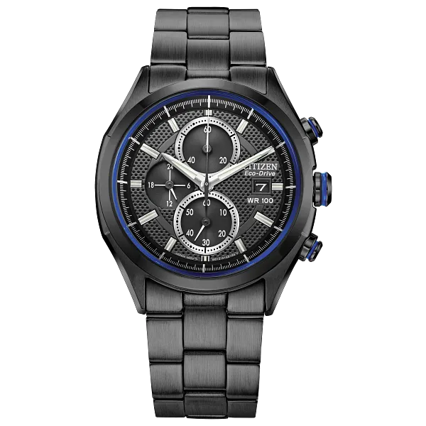 For a more monochrome look, this DRIVE from CITIZEN® watch pairs a black stainless steel bracelet and black 41mm stainless steel case with a black dial with subtle blue accents. Advanced features include Eco-Drive technology, meaning it is powered by light — any light — as well as a chronograph, the current date and the ability to display 12/24 hour formats. This is a modern take on a bold classic that will be a perfect fit in any collection.