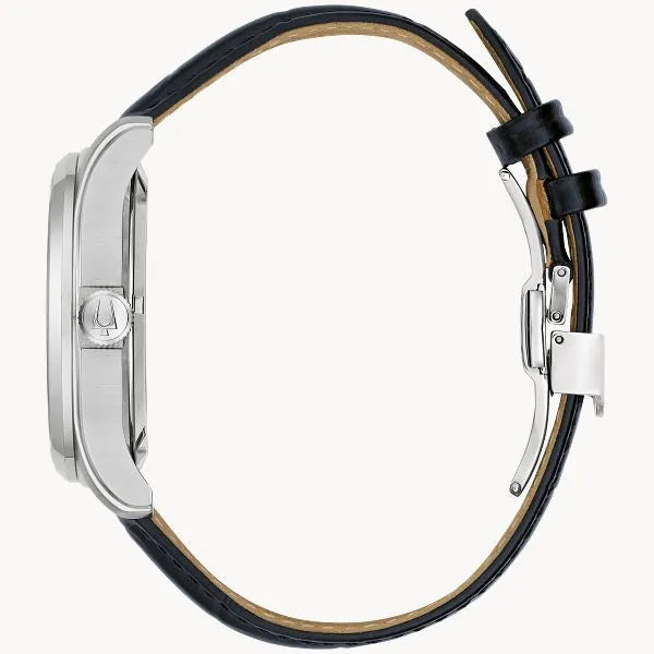 Timeless elegance is effortlessly combined with advanced GMT function in the luxurious, new Wilton Automatic timepiece from the Bulova Classic collection. This traditionally styled watch features an innovative, new automatic movement with the ease of setting the hour hand to another time zone without affecting the accuracy while traveling anywhere in the world – and the dual time can be read at glance. The sophisticated design of the silver-tone stainless steel case showcases a blue 4-hand GMT dial with a calendar, Roman numeral markers, and an anti-reflective, domed sapphire crystal. The GMT hand’s luminous tip is bordered in a tone to match the color of the “GMT” printed on the dial and works with the bi-colored dial ring with a 24-hour indication to mark the 2nd time zone. The dial features a World Map with the land area raised in a cd groove texture with latitude and longitude coordinates also raised over the sea. The black embossed alligator grain leather strap with tone-on-tone stitching, nubuck lining and double-press deployant buckle closure completes the richly elegant feel. This watch’s self-winding 24 jewel automatic movement ensures optimal performance and features a 42-hour power reserve making it the ultimate timepiece for world travelers and fine watch enthusiasts alike. Water resistant to 30 meters.