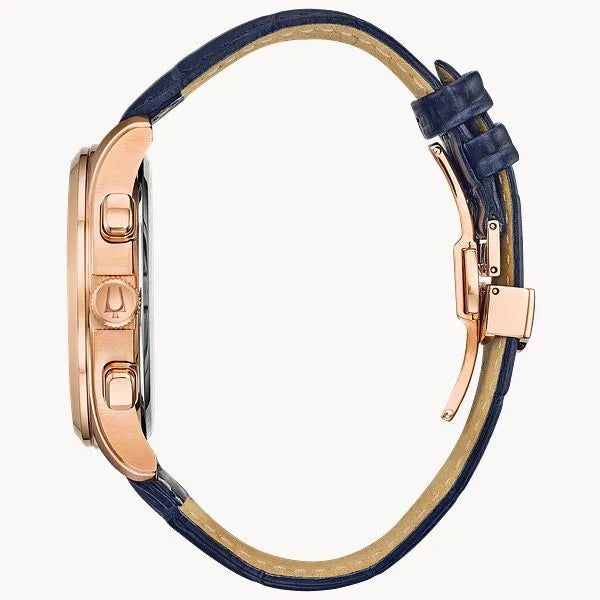 From the Classic Collection. New Wilton style with six-hand chronograph function. Rose gold-tone stainless steel case with applied Roman markers, tachymeter and calendar feature on dark blue textured dial, domed mineral glass, croco-embossed blue leather strap with double-press deployment closure, and water resistance to 30 meters.