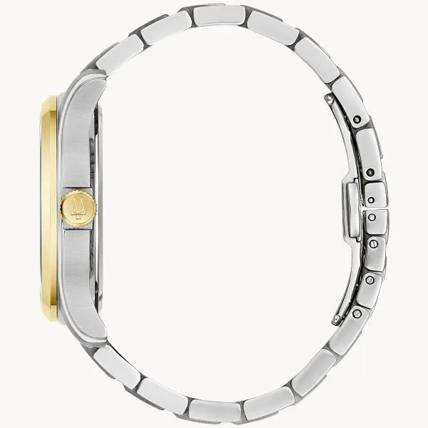 Pay homage to simpler times with the Wilton menβs timepiece from the Bulova Classic collection. This straightforward yet elegantly updated, two-tone watch features a brushed gold- and silver-tone stainless steel case that holds the lustrous silver-white, 3-hand dial with sunray detail, calendar, polished Roman numeral markers, and a domed crystal. The gold- and silver-tone stainless steel bracelet features a deployant buckle with pushers for easy accessibility. Get back to basics in style with the classic Wilton from Bulova.