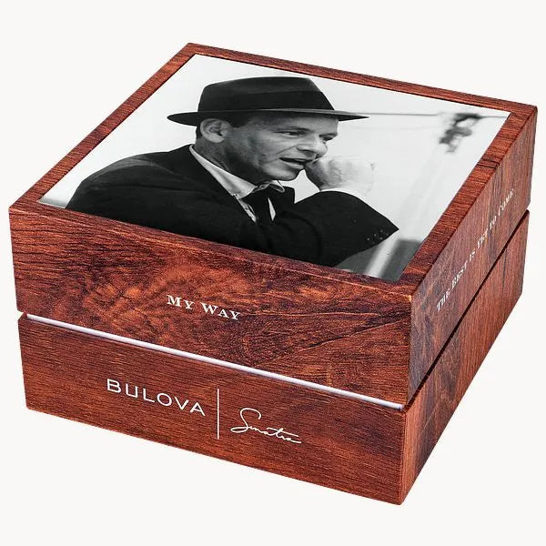 Incorporating vintage Bulova designs with the unmistakable elements of legendary performer, Frank Sinatra, the ‘Young At Heart’ watch features a tonneau shaped gold-tone stainless steel case with gold-tone hands and markers. Frank Sinatra’s signature and iconic Fedora Hat are displayed on the rich whiskey color sunray dial. The watch features a Miyota Caliber 8215 21-jewel automatic movement with a 42-hour power reserve and calendar. The exhibition case back showcases the fine movement and features the song title as well as the iconic Fedora Hat, which can also be found etched on the crown. The padded brown leather strap features a deployant buckle and is stamped with ‘Young At Heart’ along the inside. The watch features a domed sapphire crystal with AR coating and water resistance to 30 meters.